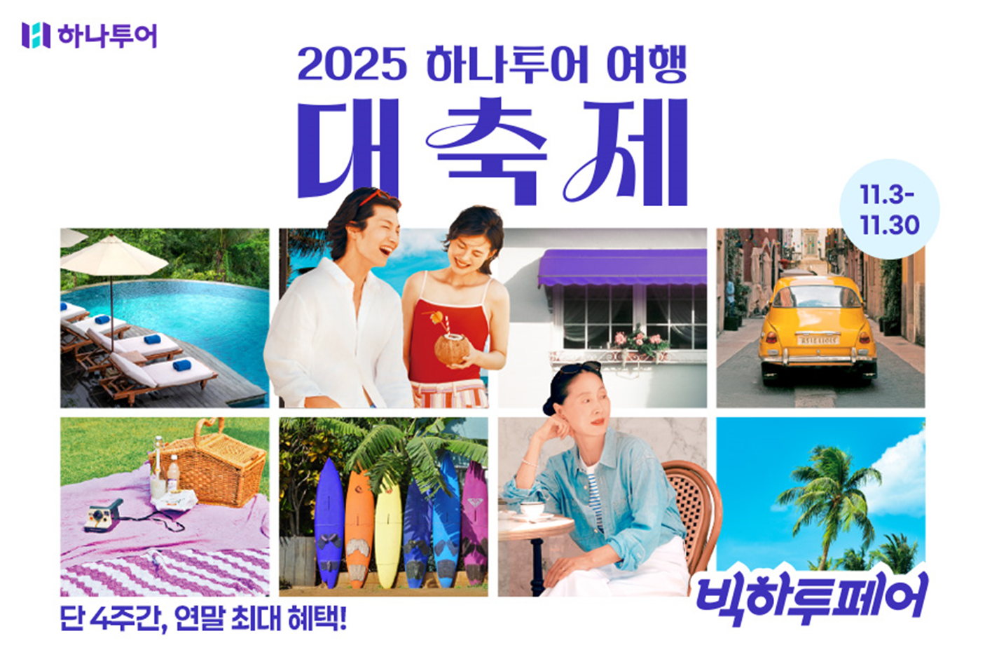 (주)하나투어(대표이사 송미선)가 겨울 방학과 연말연초 여행객을 위해 다양한 상품과 혜택을 한자리에 모은 ‘2025 하나투어 여행 대축제, 빅하투페어’를 오는 30일까지 진행한다.